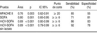 La medición de lactato al ingreso, a las 24 horas y la depuración de lactato no predijeron mortalidad, posiblemente por dos factores: en primer lugar, el tamaño de la muestra, y en segundo, los niveles de lactato obtenidos. Aunque no existe un punto exacto de corte para establecer un peor pronóstico, la mayor mortalidad relacionada al lactato se presenta especialmente en pacientes con valores de lactato ≥ 4 mmol/L,23 situación que en nuestra población no sucedió con la frecuencia necesaria para poder realizar un análisis. Probablemente por esta misma razón, tampoco observamos una diferencia estadística entre el mCV-SOFA y mCV-SOFA sin lactato. Sin embargo, en México, la medición de lactato no se encuentra disponible en todas las unidades de terapia intensiva, por lo que este enfoque (mCV-SOFA sin lactato) podría ser de gran utilidad en unidades con bajos recursos.