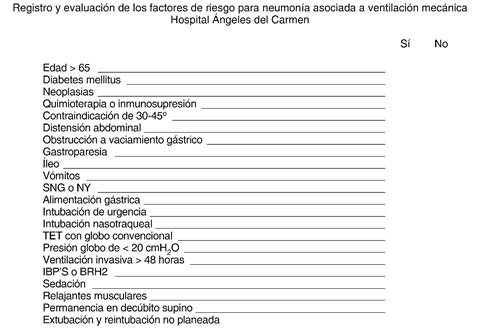 Se utilizó un formato para registrar la intubación, sus características e incidentes, así como la elaboración y llenado de una lista de verificación de los factores de riesgo presentes en cada paciente intubado, lo que permitió dar valor numérico según los riesgos presentes (Anexo 1). Se elaboró y llenó un formato para el registro diario, en turnos subsecuentes, que midió el cumplimiento y apego a las acciones incluidas en el protocolo en los diferentes turnos del día laboral en todos los pacientes en AMV (Anexo 2).