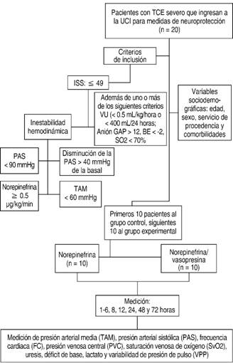 Se incluyeron pacientes con diagnóstico de traumatismo craneoencefálico politraumatizado hemodinámicamente inestable en protocolo de neuroprotección que requirieran aporte de vasopresor y que ingresaron a la unidad de cuidados intensivos del Centro Médico «Lic. Adolfo López Mateos» del Instituto de Salud del Estado de México.