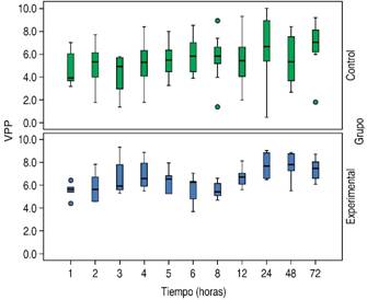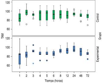 En el análisis de las variables hemodinámicas, ambos grupos mantuvieron las medianas en metas de TAM (control 93 versus experimental 90 mmHg) (Cuadro III); sin embargo, en el análisis estadístico de las diferencias entre rangos se encontraron diferencias significativas en algunas variables y periodos de medición a favor del grupo control tales como presión arterial media en la segunda hora (p = 0.035) (Figura 2), variabilidad de presión de pulso a la hora tres (p = 0.009) y hora 48 (p = 0.015) (Figura 3), además de saturación venosa de oxígeno a la hora 48 (p = 0.023) (Figura 4).