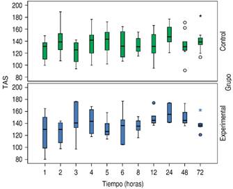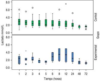 Las mediciones de variables a favor de grupo experimental fueron: presión arterial sistólica a la primera hora (p = 0.041) (Figura 5), frecuencia cardiaca en la primera hora (p = 0.029) (Figura 6), así como lactato sérico en la hora 5 (p = 0.015) (Figura 7). Sin embargo, los cambios significativos no conservaron una tendencia en el resto de las mediciones.