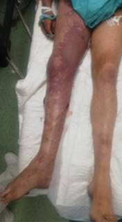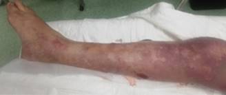 Figura 3: Cara anterior y lateral de pierna derecha con mancha violácea de bordes cartográficos y edema; además ampollas hemorrágicas flácidas.