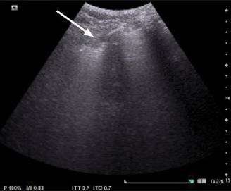 Figura 2: Consolidación subpleural (punta de la flecha) en modo bidimensional con transductor convexo.