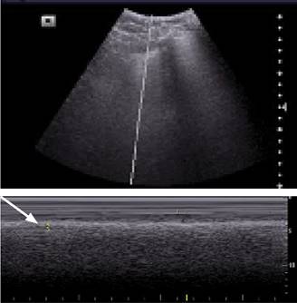 Debido a que en modo B con el transductor convexo es difícil medir y poder ser más objetivo en la magnitud de estas consolidaciones, propusimos la medición de dichas consolidaciones con un transductor convexo y en modo M.