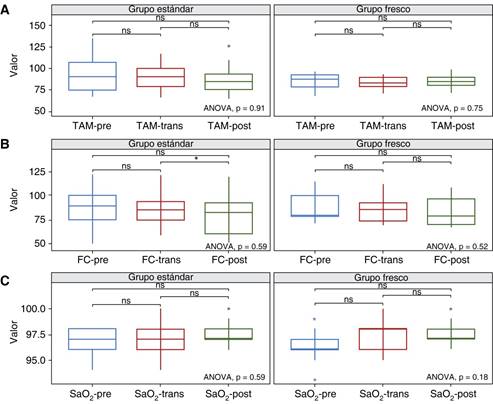 Figura 1: Gráficas de caja y bigotes que representan los parámetros clínicos de la tensión arterial media (TAM), la frecuencia cardiaca (FC) y SaO2, antes (pre), durante (trans) y después (post). Se muestra la significancia estadística * p ≤ 0.05.