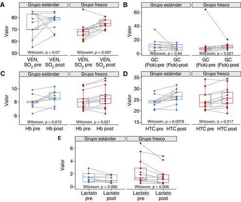 También se analizaron otros parámetros clínicos y de laboratorio antes (pre) y después (post) de la transfusión sanguínea. Es interesante observar que en este análisis se encontraron diferencias estadísticamente significativas para los parámetros ventilatorios de la saturación de oxígeno (VEN SO2), el gasto cardiaco (Fick) y el lactato antes y después de la transfusión para el grupo de pacientes transfundidos con paquete fresco (Figura 2A, B y E). Mientras que en los parámetros de hemoglobina (Hb), el hematocrito (HTC) antes y después de la transfusión se observaron diferencias significativas tanto para el grupo de pacientes transfundidos con paquete fresco como para el grupo con paquete estándar (Figura 2C y D).
