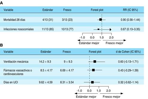 Por lo que para la variable ventilación mecánica se encontró una diferencia de 0.60 desvíos estándar entre el grupo que recibió el paquete globular estándar y el paquete globular fresco, mientras que para los fármacos vasoactivos o cardiovasculares se encontraron 0.43 desvíos estándar entre los pacientes que recibieron el paquete estándar y fresco. Por otro lado, se observó que para los días de estancia en la UCI fue de 0.32 desvíos estándar entre los pacientes que recibieron paquete estándar y paquete fresco (Figura 3B).