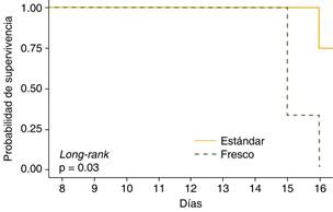 En el análisis de supervivencia no se observó diferencia estadística entre la mortalidad de los pacientes que fueron transfundidos con paquete estándar y fresco, siendo 17 días la mediana de supervivencia para los pacientes que recibieron paquete fresco y de 15 días los que recibieron paquete estándar (p = 0.3) (Figura 4).