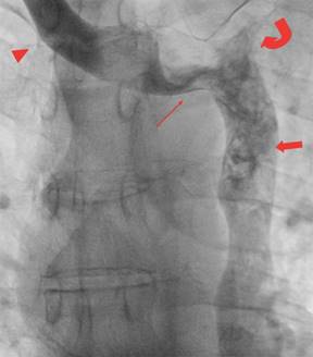 Figura 3: Fluoroscopia en venografía selectiva con sustracción digital, donde se observa aplicación del medio de contraste a través de la vena yugular derecha (cabeza de flecha) con paso del medio a través de vena braquiocefálica derecha (flecha delgada) a la cava superior izquierda (flecha gruesa). Se identifica vena braquiocefálica izquierda (flecha curva).