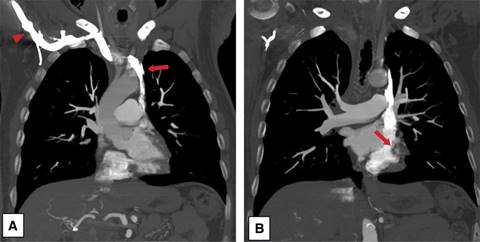 Figura 4: Angiotomografía en reconstrucciones multiplanares coronales. A) Se observa paso del medio de contraste por cateterización en brazo derecho por vena subclavia ipsilateral (cabeza de flecha) con paso de medio de contraste, el cual cruza la línea media hasta situarse del lado izquierdo (flecha gruesa). B) Llegada de medio de contraste a través de cava izquierda a aurícula derecha (flecha delgada). Nótese la ausencia de vena cava derecha.