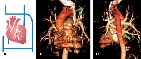 Figura 7: A) Representación esquemática del caso de paciente actual, que muestra vena cava izquierda persistente con involución de vena cava superior derecha. B) Reconstrucción 3D en plano coronal con una vista anterior, donde se muestra vena braquiocefálica derecha (flecha delgada) que drena a vena cava inferior (cabeza de flecha) y su llegada a aurícula. C) Se muestra vista posterior, donde se demuestran las relaciones de la vena cava izquierda con la arteria pulmonar (cabeza de flecha), aurícula izquierda (flecha) y cayado aórtico (flecha delgada).