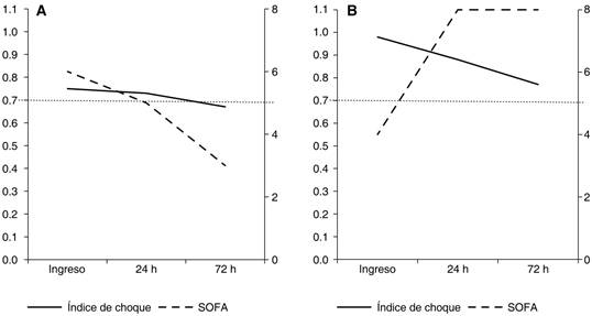 Figura 2: Comparación de la evolución del índice de choque entre los pacientes sin (A) y con progresión de la disfunción orgánica (B).