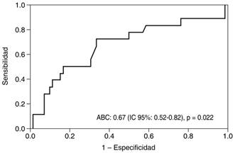 Figura 3: Área bajo la curva ROC del índice de choque > 0.7 lat/min/mmHg al ingreso a la UCI para predecir la disfunción orgánica en pacientes con choque circulatorio. ROC = Receiver Characteristics Operative Curve. UCI = unidad de cuidados intensivos. ABC = área bajo la curva.