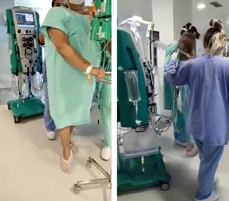 Figura 2: Deambulación de paciente sometido a terapia de reemplazo renal continua. Aportación de los fisioterapeutas Cristiano dos Santos Rodríguez y Paulo R. Marques Filho del Hospital Ernesto Dornelles, Porto Alegre, Brasil.
