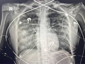 Figura 2: Radiografía de tórax, en la que se muestra cánula de membrana de oxigenación extracorpórea y balón de contrapulsación aórtica de 2 cm por debajo de la carina.