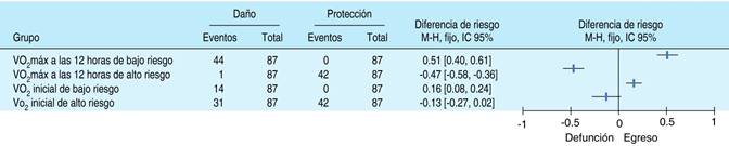 Tabla 1: Relación de χ2 de VO2máx a las 12 horas y motivo de egreso dividido en grupos de riesgo (valor de cohorte VO2máx bajo riesgo ≥ 19 mL/kg/min VO2máx de alto riesgo < 19 mL/kg/min).