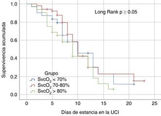 Análisis de las variables como factor pronóstico de mortalidad. A través de la regresión logística binaria se analizó la variable respiratoria PaO2/FiO2 con la mortalidad (media de 100 mmHg) presentando una relación inversa con un exponente B -0.013 y OR de 0.98 (IC 95% 0.97-0.99) p = 0.04. Tomando como referencia al grupo 1 con SvcO2 < 70%, el grupo de SvcO2 de 70-80% presenta una relación inversa con mortalidad con un exponente B -0.185 y OR de 0.83 (IC 95% 0.33 - 2.00) p = 0.69 en contraparte con el grupo 3 (SvcO2 > 80%) que presenta un exponente B de 1 con OR de 2.93 (IC 95% 0.97-8.8) p = 0.05 (Tabla 3). Se realizó análisis de supervivencia con Kaplan-Meier entre los tres grupos y el tiempo de estancia en la UCI, no se encontró significancia estadística (Figura 1).