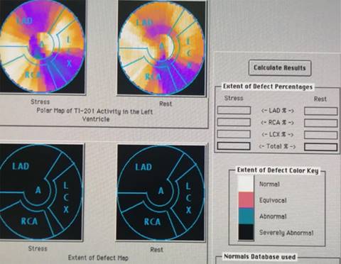 Fue llevada a medicina nuclear para estratificación coronaria de riesgo con isonitrilos, con lo cual se documentó miodilatada en fase de aturdimiento con defectos multivaso al estrés farmacológico con muy discreta mejoría al reposo, ante lo cual se difirió estratificación invasiva por riesgo de necrosis tubular aguda asociada a nefropatía inducida por contraste y ante la necesidad de mantener función renal residual (Figura 2).