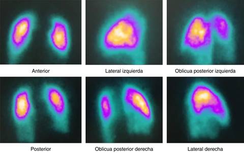 Figura 3: Perfusión pulmonar. Defectos segmentarios de distribución vascular pulmón izquierdo y defecto basal derecho.