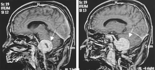 El estudio de elección para diagnosticar los schwannomas es la resonancia magnética, siendo la prueba de mayor definición. En este caso, encontramos afectado el bulbo raquídeo que contiene estructuras como el centro cardiorrespiratorio, los nervios glosofaríngeo y vestibulococlear y el centro de deglución; el efecto de masa explica los síntomas de hipoacusia sensorial ipsilateral y disfagia por la abolición del reflejo de deglución. Otra estructura afectada es el centro cardiorrespiratorio, que al estar siendo comprimido resulta en un estado de acidosis respiratoria crónica.