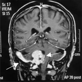 Las estructuras involucradas neurológicamente en el paciente, llevan a un cuadro clínico confuso, ya que la masa tiene una localización intra y extracraneal, algo poco frecuente en los schwannomas.