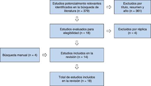 Mediante los métodos de búsqueda se identificaron 379 estudios. Una vez preseleccionados, se evaluó la congruencia con los criterios de inclusión y exclusión; para posteriormente, descartar 365 estudios. Se sumaron a éstos, cuatro estudios por búsqueda bibliográfica manual. En total, 18 estudios hicieron parte de esta revisión (Figura 1).