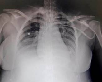 Al momento de su ingreso a unidad de cuidados intensivos (UCI), se encuentra a la exploración física con tensión arterial de 100/52 mmHg, presión arterial media de 68 mmHg, frecuencia cardiaca 91 lpm y temperatura de 37 grados, bajo efectos de sedación con propofol, RASS-5 (por sus siglas en inglés Richmond Agitation-Sedation Scale), intubación orotraqueal conectada a ventilador mecánico en modalidad control volumen, con volumen tidal 375 mL, PEEEP (por sus siglas en inglés positive end-expiratory pressure) 5, cmH2O, FiO2 40%, reporte de gasometría arterial pH 7.20, PaCO2 40 mmHg, PaO2 83 mmHg, HCO3 15.7, DB -12.5, con saturación periférica 96%, hemodinámicamente sin requerimientos de vasopresor, en anuria. Se objetivó en la analítica clínica deterioro de la función renal con incremento en las cifras de azoados, aumento de transaminasas, bilirrubina: deshidrogenasa láctica (DHL) y elevación importante de ácido úrico, así como anemia, trombocitopenia e incremento en el conteo leucocitario: urea 140 mg/dL, creatinina 7.34 mg/dL, ácido úrico 8.5 mg/dL, los electrolitos reportaron Na 136 mEq/L, K 6.8 mEq/L, CL 106 mEq/L, P 11.7 mEq/l, Mg 5.3 mEq/L, Ca 7.28 mEq/L, las pruebas de función hepática reportaron aspartato aminotransferasa 32 UI/L, alanina aminotransferasa 64 UI/L, fosfatasa alcalina 78 UI/L, DHL 3575 UI/L, bilirrubina total 0.24 mL/dL, en lo hematológico con presencia de gingivorragia y hematomas en extremidades, reporte de laboratorio con Hb 7.5 g/dL, hematócrito (HTO) 22.7, plaquetas 17, 000, leucocitos 36, 410, tiempo de protrombina (TP) 13.7, tiempo parcial de tromboplastina (TPT) 29.5, INR 1.21. Se calculó un SOFA score a su ingreso de 11 puntos con mortalidad de 50%. Se inició tratamiento de reanimación con líquidos para optimizar la función renal sin mejoría, considerándose candidata para terapia de reemplazo renal. Se realiza transfusión una aféresis plaquetaria, colocación de catéter de hemodiálisis e inicio de terapia de reemplazo renal lenta continua (TRRLC) mediante hemodiafiltración venovenosa continua (HDFVVC). La radiografía anteroposterior de tórax mostró tejidos blandos de adecuada densidad, estructuras óseas de densidad normal, parénquima pulmonar normal con presencia de derrame pleural bilateral (Figura 1).