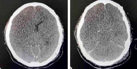 A las 48 horas de su ingreso a UCI, presenta cambios en estado neurológico con pupilas midriáticas de 5 mm sin respuesta a estímulos luminosos, hipotensión arterial que requirió inicio de vasopresor. Se realiza tomografía simple de cráneo que reporta edema cerebral difuso y hemorragia subaracnoidea (Figura 2). Se realiza electroencefalograma que reporta ausencia de actividad cortical cerebral. En el tercer día de su ingreso a la UCI, presenta hipotensión arterial con incremento en las dosis de vasopresor, presentando de manera posterior bradicardia y asistolia, iniciando maniobras de reanimación cardiopulmonar sin retorno a la circulación espontánea.