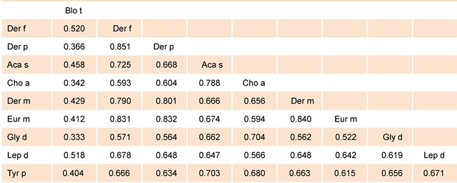 The family Acaridae showed a high correlation between them (p < 0.001, r 0.703), but also both species of this family (Tyr p and Aca s) had a close correlation with Cho a from Chortoglyphidae family (p < 0.001, r 0.788 to 0.680 for Aca s and Tyr p). Glycyphagidae species had a moderate correlation between them and low to moderate with other mites. The only exception was Gly d with a high correlation with Cho a (p < 0.001, r 0.704).