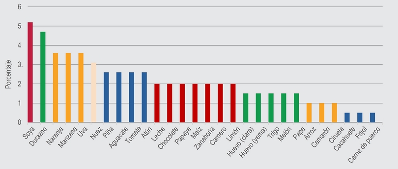 De acuerdo con la distribución geográfica, en países europeos los alimentos más frecuentes que producen alergia son la leche de vaca, huevo, trigo, soya, cacahuate, frutos secos, pescado y mariscos.8 En Estados Unidos existe una prevalencia similar para dichos alimentos.9 En México, los alimentos más frecuentemente identificados mediante las pruebas cutáneas fueron queso, cacahuate, atún, frijol, chile y camarón; los resultados variaron según los diferentes grupos de edad.10