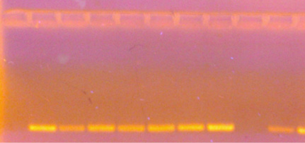 Figura 1 Bandas sobre gel de agarosa de 144 pb, teñidas con bromuro de etidio, que corresponden al producto amplificado del polimorfismo 308 del gen TNFα.