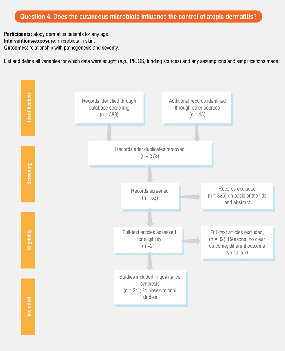 This guideline update was focused on new information about some practical interventions in dermatitis. Characteristics of the epidemiology, classification, and pathogenesis of the disease are discussed in detail in the 2015 Consensus.20 ARIA (Allergic Rhinitis and its Impact on Asthma) report protocol was used as a model22 and the update protocol was based on PRISMA recommendations (see supplementary material).23