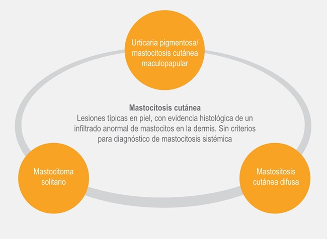Los desórdenes relacionados con la activación mastocitaria pueden darse por alteración primaria de los mastocitos (intrínseca) o por mecanismos no derivados de estos (extrínsecos) (figura 1).6 Entre los desórdenes asociados con la activación primaria de los mastocitos está la mastocitosis, que a su vez puede ser clasificada como cutánea4,9,10 (figura 2) y sistémica, según los criterios de la Organización Mundial de la Salud actualizados en 20084,9,10 (figura 3), y el síndrome de activación monoclonal de mastocitos, con un componente proliferativo y, por ende, carga mastocitaria más baja.7 Ambos son considerados como desórdenes clonales de mastocitos.