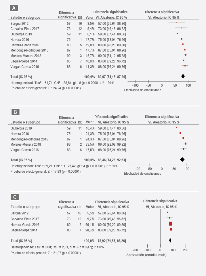 A search of real-life studies on the effectiveness of omalizumab in asthma control conducted in Latin America was carried out. The average of the aggregate effectiveness of omalizumab in asthma control (Pooled Analysis) was estimated by using a random effects model.