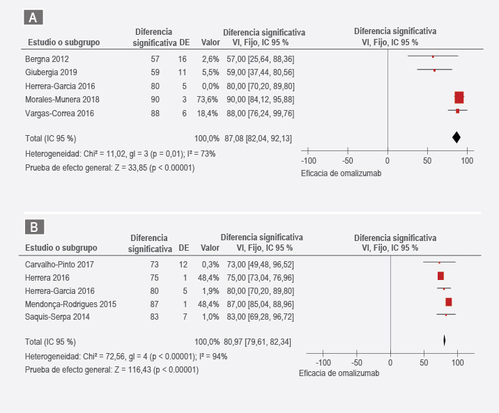 Figura 2 Efectividad agregada del omalizumab en el control del asma grave registrada en los estudios analizados. A) prospectivos. B) Retrospectivos.