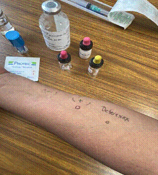 Se inició tratamiento con flebotomía, pero al no obtener las concentraciones esperadas de ferritina y debido al difícil acceso venoso se indicó deferasirox, en dosis de 500 mg/día. Después de la segunda dosis manifestó urticaria y en la tercera edema laríngeo, por lo que requirió hospitalización. Con la sospecha de alergia al fármaco fue enviada al servicio de Alergología, donde le practicaron una prueba cutánea para deferasirox (Figura 1), con resultado positivo (3 mm con control negativo en 0 y positivo con histamina 5 mm). Se hospitalizó a la paciente para realizar el protocolo de desensibilización de 12 pasos (Cuadro 1), para una dosis terapéutica de 1500 mg/día (Cuadro 2). El protocolo de desensibilización tuvo una duración de 3 días: en el primero se administraron 7.5 mg, en el segundo 30 mg (con la que manifestó eritema en el cuello y abdomen, edema en la cara y prurito, por lo que se prescribieron: antihistamínico y corticosteroide por vía intravenosa, con adecuada respuesta de la reacción alérgica) y en el tercero, luego de aplicar 450 mg, manifestó prurito, por lo que se indicó un antihistamínico y al llegar a 750 mg tuvo urticaria, por lo que se decidió mantener una dosis de 450 mg.
