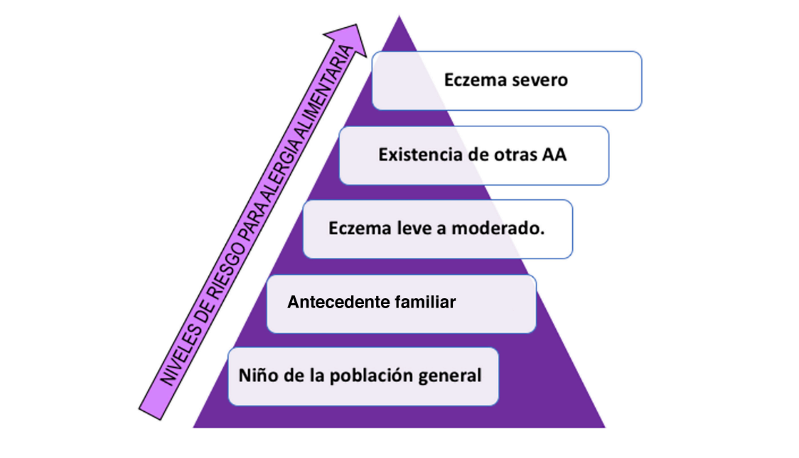 Dermatitis atópica: es el principal factor de riesgo de alergia alimentaria, al permitir la penetración de alergenos por la barrera epitelial incompetente. A mayor gravedad de la dermatitis atópica mayor riesgo de alergia alimentaria.32Figura 2