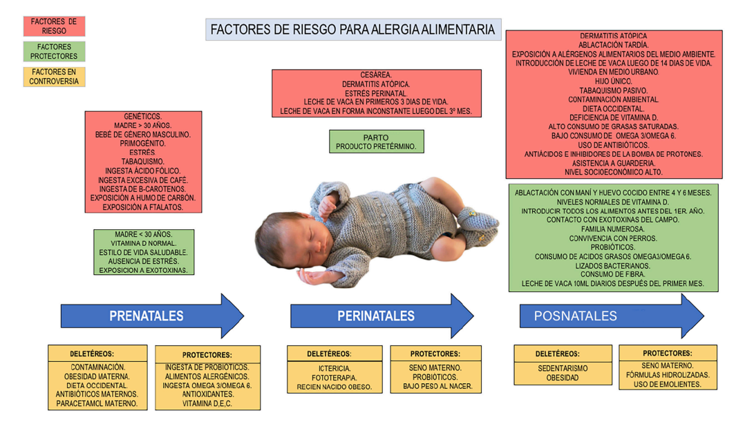 La alergia alimentaria aparece frecuentemente y depende de múltiples factores de riesgo (genéticos y ambientales), que a su vez se dividen en: factores prenatales, natales y posnatales; participan en la expresión de la enfermedad y no en todos los casos es posible la intervención clínica.