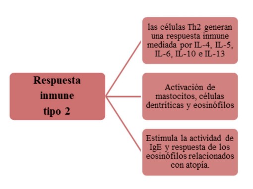 El modelo de respuesta inmune tipo 1 y tipo 2 se refiere a distintas reacciones inmunitarias que reguladas por subpoblaciones de células T CD4+, conocidas como T helper 1 (T1) y T2, respectivamente. Las células T1 secretan interleucina-2 (IL-2), interferón-y (IFN y) y linfotoxinas α, estimulando la inmunidad tipo 1, que se caracteriza por una prominente actividad fagocítica. Por su parte, las células T2 secretan principalmente las citoquinas prototípicas IL-4, IL-5 e IL13, y estimulan la inmunidad tipo 2, caracterizada por elevada concentración de anticuerpos y eosinofilia. La respuesta inmune tipo 2 de la vía aérea está mediada, principalmente, por eosinófilos, mastocitos, basófilos, células T2, grupo 2 de células linfoides innatas y células B productoras de IgE5