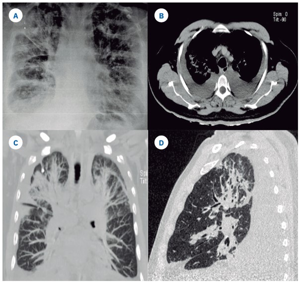 Figura 1 Figura 1. A) Radiografía de tórax que muestra infiltrados reticulares bilaterales, que confluyen en las bases pulmonares. B, C, D) Tomografía de tórax que evidencia engrosamiento intersticial peribroncovascular, bilateral, asimétrico en ambos lóbulos superiores, con bandas de atelectasia y derrame pleural bilateral que provoca colapso pulmonar de los segmentos basales.