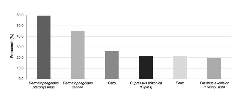 Los aeroalérgenos más frecuentes que provocaron reactividad cutánea fueron: ácaros de polvo; Dermatophagoides pteronyssinus (59.5%) y Dermatophagoides farinae (45.3%), seguido del epitelio animal de gato (26.1%), Cupressus arizónica (21.7%), epitelio animal de perro (21.6%) y Fraxinus excelsior (Fresno, Ash) (19.6%).