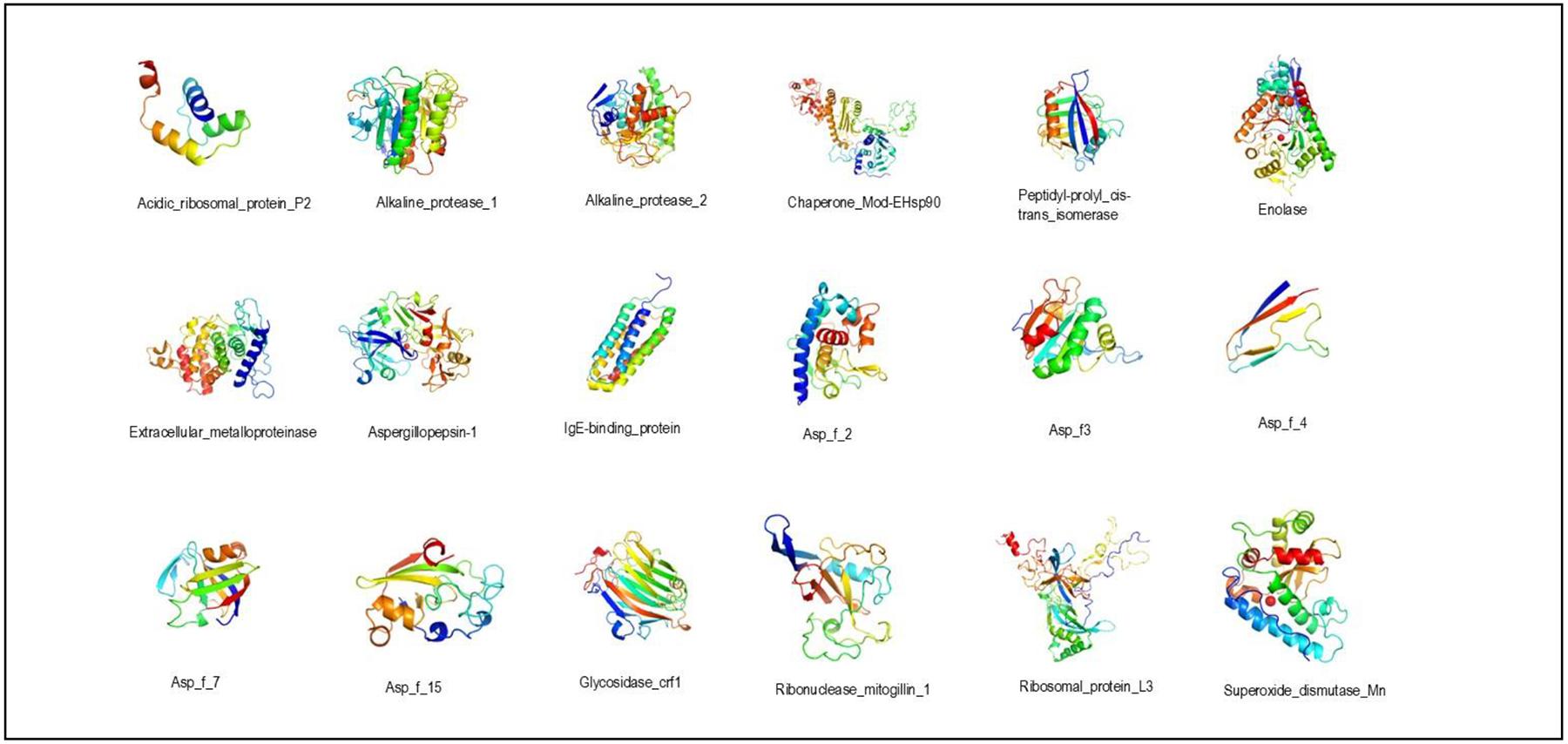 Allergens from A. fumigatus were modeled to predict B cell epitopes. All models showed typical folding related to the family protein they belonged. Seven allergens didn’t exhibit any identity with proteome from D. pteronyssinus but were modeled to further comparative analysis (Table 1 and Figure 1).