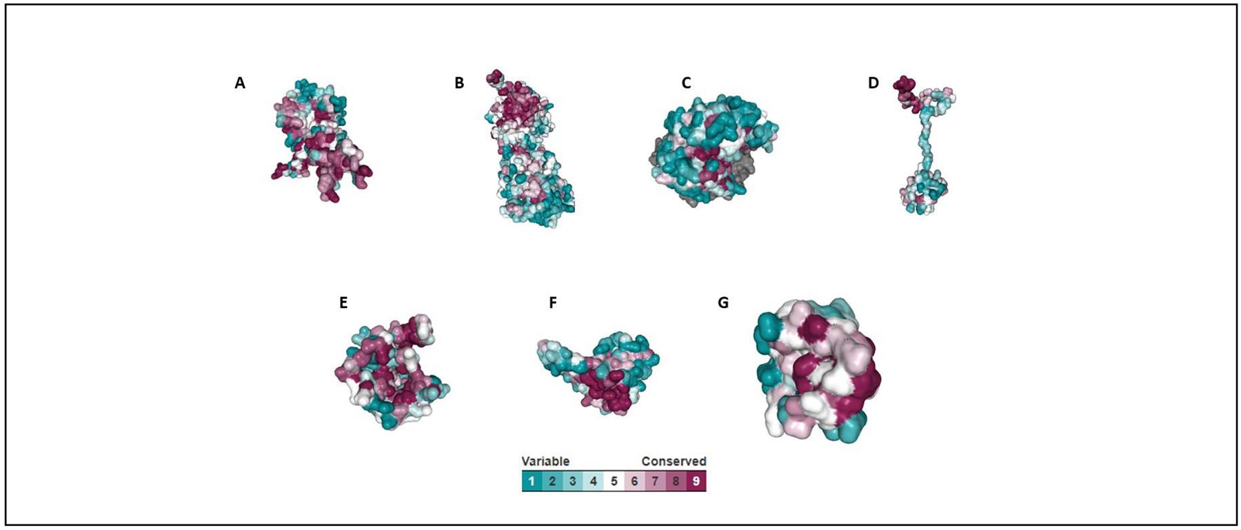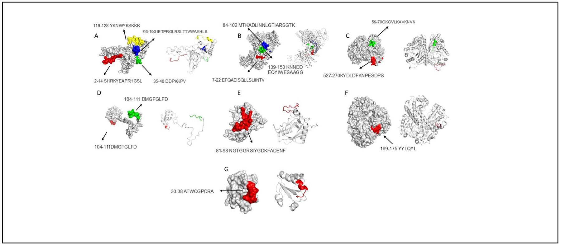 Figure 2. Surface and cartoons models showing predicted epitopes between A. fumigatus and D. pteronyssinus. A: Ribosomal protein L3, B: HSP90, C: Enolase, D: Acidic ribosomal protein P2, E: peptidyl-propyl cis-trans isomerase, F: MnSOD and G: Thioredoxins.