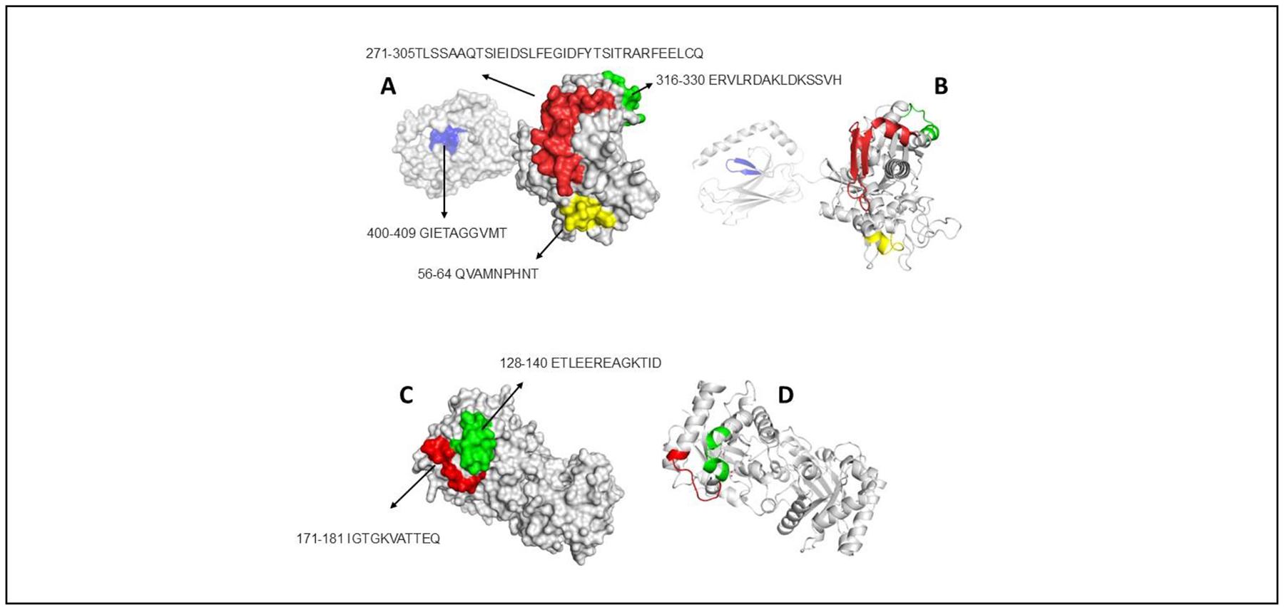 Figure 4. Surface and cartoon models showing conserved epitopes between allergen characterized in D. pteronyssinus and Homologous of A. fumigatus. A: Surface model showing epitopes on Der p 28, B: Cartoon model to show epitopes on model of Der p 28, C and D: Surface and cartoon models of allergen Der p 25.