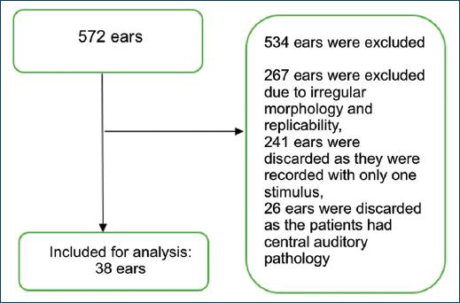 A total of 300 patient records with CALAP records were reviewed, which included 572 ears, of which 534 ears were excluded because the CALP records presented different situations that influenced their exclusion, such as poor morphology and irregular replicability and patients with central auditory pathology, records with only one type of stimulus, presence of noise, etc. A total of 38 ears, 22 right ears, and 16 left ears were selected that had good quality SLAEP recordings with both Click and CE-Chirp, with replication at all intensities with threshold search up to the lowest possible intensities and that both recordings were made during the same session (Fig. 1).