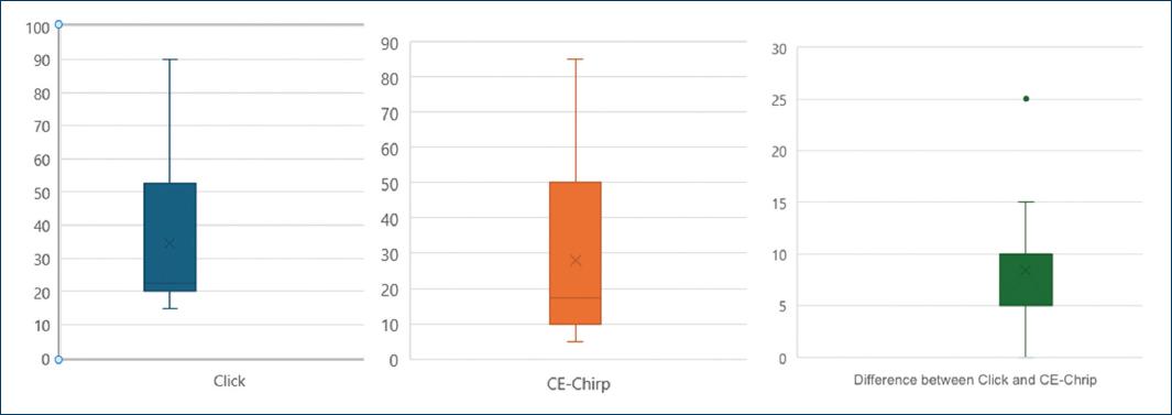 The threshold difference between CE-Chirp and Click was 6.57 dB, and the thresholds obtained with CE-Chirp are lower than with Click. Therefore, thresholds between 20 dBnHL and 25 dBNHL with CE Chirp should be considered normal, unlike the Click that is universally accepted as normal with 30 dBnHL or less.