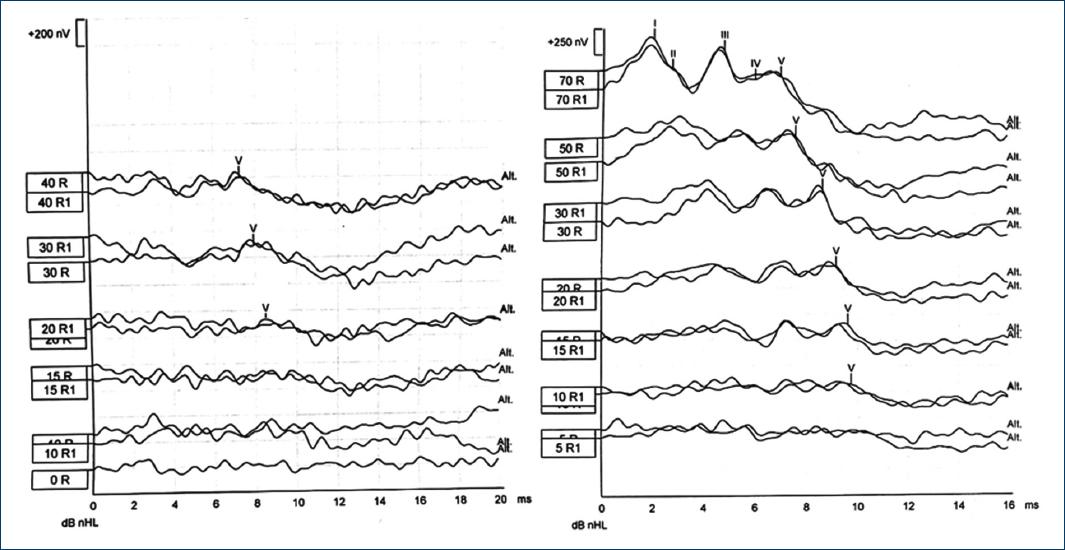 Short-latency auditory evoked potentials (SLAEP) are defined as the bioelectrical response recorded in the scalp after the activation of the fibers of the auditory pathway (from the auditory nerve to the inferior colliculus), and this response consists of a sequence of up to seven positive waves toward the vertex recorded by specialized electrophysiological equipment. The waves are usually labeled with Roman numerals of which waves I, III, and V are the most important and specifically, the V wave is used to determine the electrophysiological auditory threshold1,2.