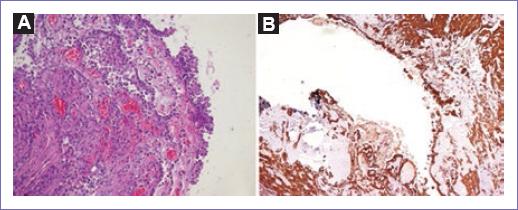 Figura 1 Fotomicroscopia. A: hematoxilina - eosina (x10): proliferación mesotelial atípica, de morfología epitelioide. B: inmunohistoquímica (x4): calretinina, positivo.