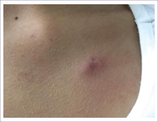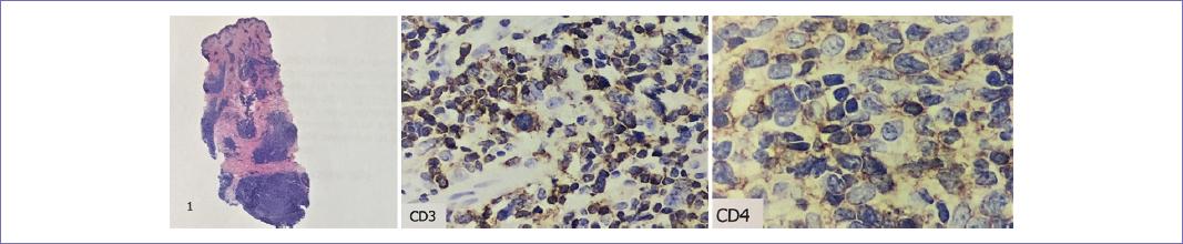 Se presenta el caso de una paciente de 21 años, sin comorbilidades previas, la cual inicia su padecimiento con presencia de lesión papular violácea en región infraclavicular izquierda, de 12 semanas de evolución, con diámetro de 15 x 10 mm en sus ejes mayores, con únicamente sintomatología pruriginosa (Fig. 1). Debido a la persistencia de la lesión se realiza una biopsia por trucut, reportando el estudio histopatológico proliferación linfoide en toda la extensión de la dermis compatible con linfoma. Se envía la pieza a inmunofenotipificación, obteniéndose hallazgos inmunohistoquímicos compatibles con linfoma T cutáneo de células pequeñas/medianas CD4+ (CD3+, CD5+, CD7+, PD1+, CD8-, CD30-) (Fig. 2).