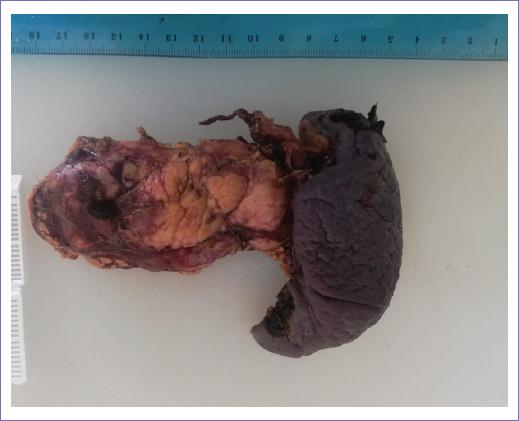 Figura 5 Se observa pieza quirúrgica donde se incluye cuerpo y cola de páncreas, así como el bazo en su totalidad.